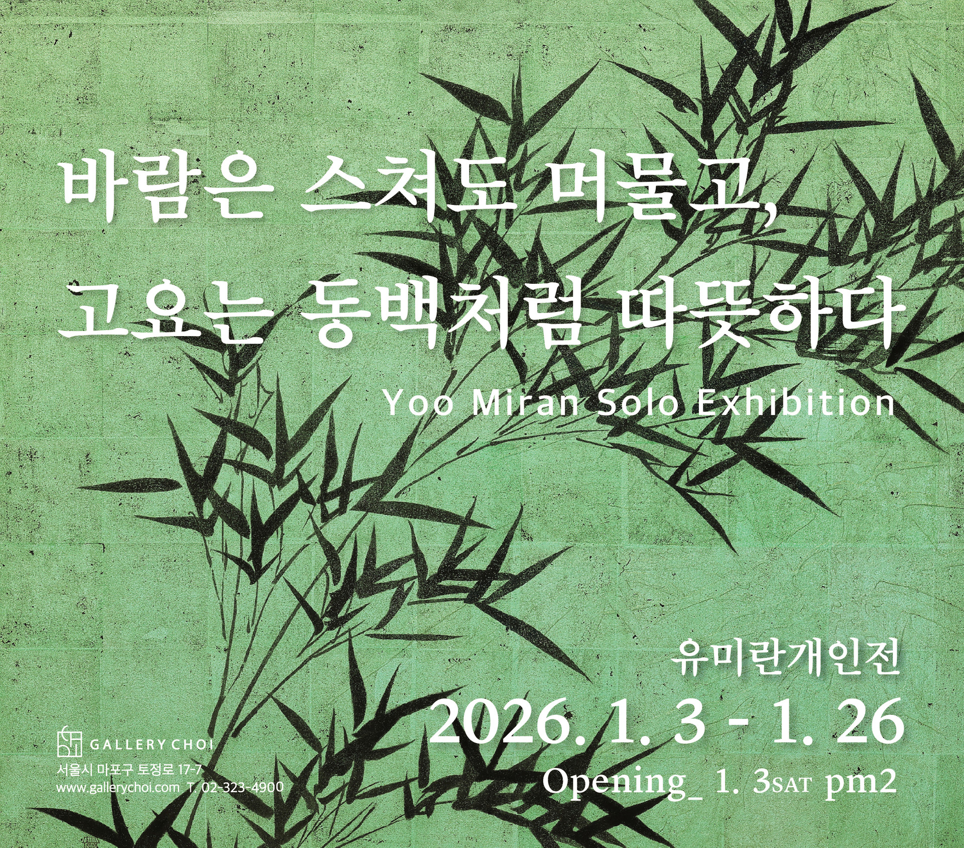갤러리초이는 2026년 첫전시로 유미란작가의 개인전 ‘바람은 스쳐도 머물고, 고요는 동백처럼 따뜻하다’를 개최한다.