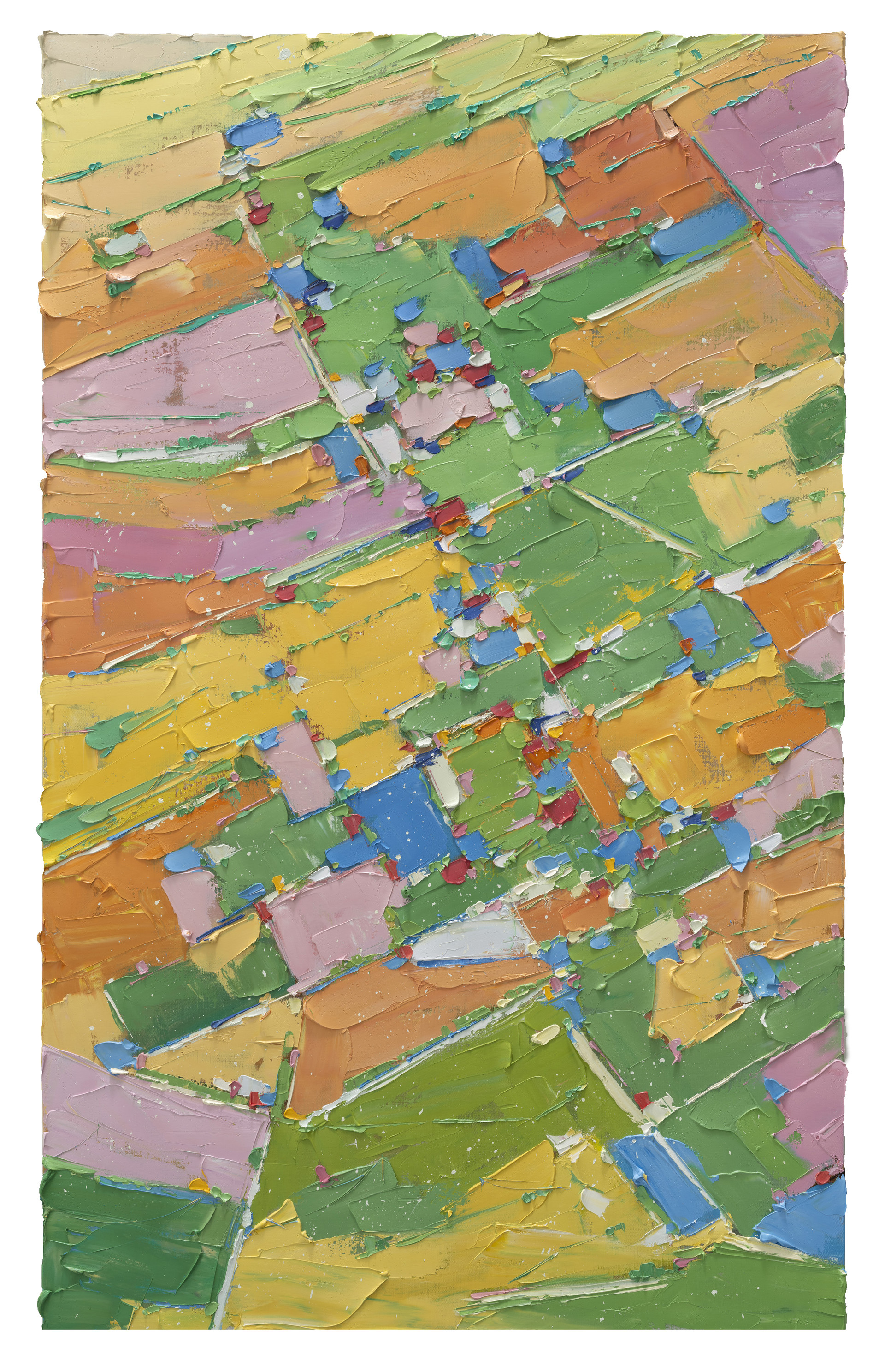 Through her work, the artist conveys consolation, harmony, and a yearning for happiness felt within the flow of life. These emotions resonate along the grain of color, forming a kind of psychological echo, a dense aesthetic of playfulness and introspection. This is not a fleeting joy, but a quiet value—like dandelion seeds spreading softly across the world—born from the artist’s open-hearted wish for his creations to offer gentle meaning. Even in the mundane landscapes of our daily lives, we may sense subtle vibrations and lingering impressions; such fleeting resonances invite the viewer to become a participant in this play of colors from above.